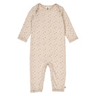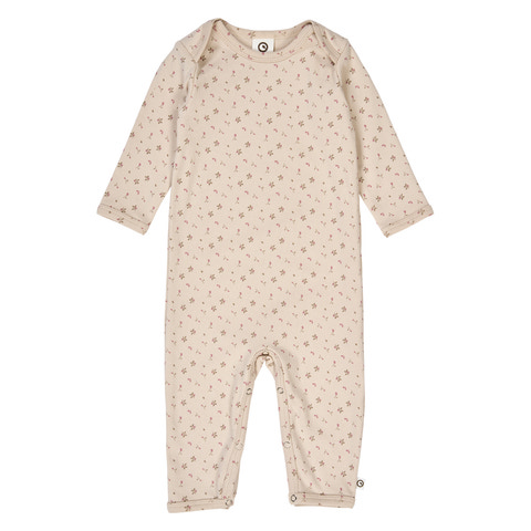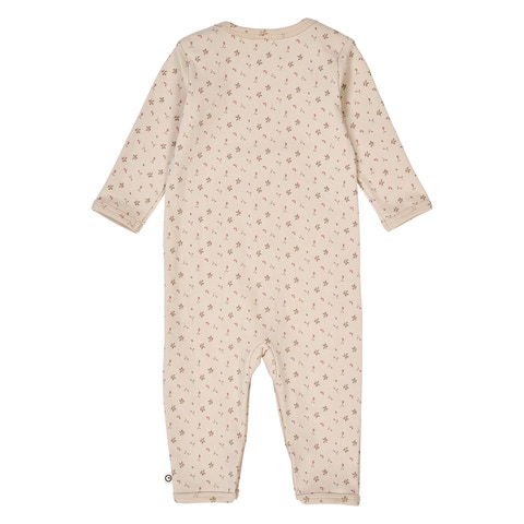 Denne fine heldragt er dekoreret med et yndigt, gennemgående blomsterprint og er både praktisk og komfortabel til de mindste. Den har amerikansk lukning ved halsen og trykknapper mellem benene, som gør det nemt at skifte ble. En ekstra kile mellem benene giver god plads til både ble og bevægelse.