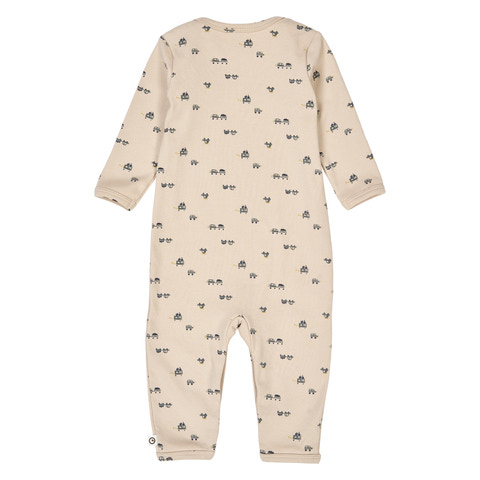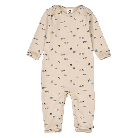 Denne charmerende heldragt er dekoreret med et fint, gennemgående print af små biler - perfekt til de mindste med fart på. Dragten har amerikansk lukning ved halsen og praktiske trykknapper mellem benene, som gør det nemt at skifte ble.