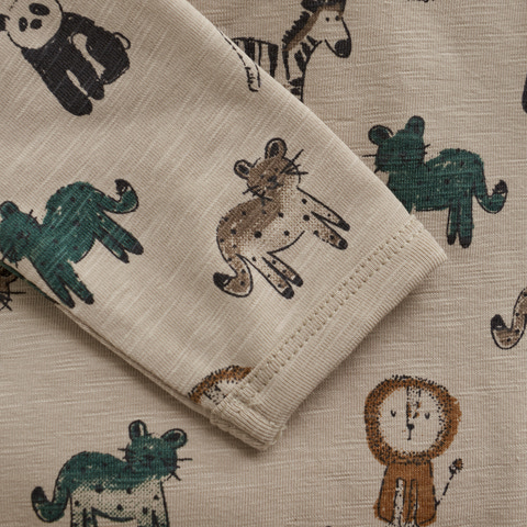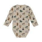 Langærmet body fra Minymo med et flot dyreprint. Denne body er syet i en blød og hudvenlig bomuldsblanding, der sikrer høj komfort for barnet. Den lukkes nemt med trykknapper mellem benene, hvilket gør bleskift hurtigt og bekvemt. Et lille Minymo-logo ved benet tilføjer en fin detalje.