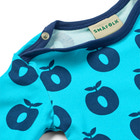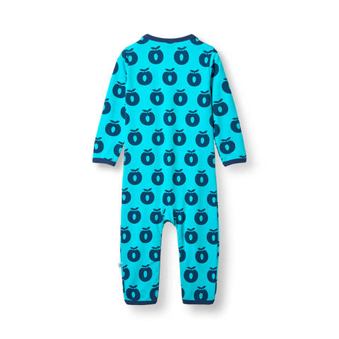 Heldragt til baby med æbler, produceret i en økologisk og strækbar bomuldsjersey. Denne heldragt er OEKO-TEX Standard 100® certificeret, hvilket betyder at dragten er produceret og testet for skadelige stoffer, så du kan passe på dit barns hud og helbred.
