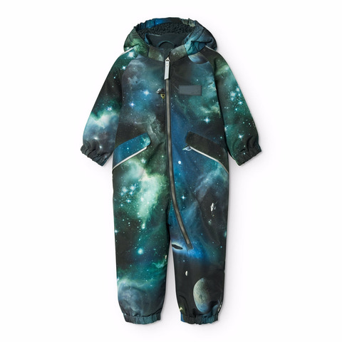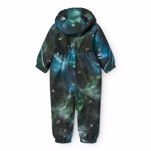 Vandafvisende flyverdragt til de mindste, fremstillet i genanvendt nylon. Dragten har en aftagelig, foret hætte og en ekstra lang lynlås på fronten, der gør den nem at tage på og af. Elastikken i lænden samt ved ærme- og ben afslutninger sørger for, at sne, regn og vind holdes ude, samtidig med at luffer og støvler bliver på plads. Flyverdragten er udstyret med refleksbånd på lommerne og ærmerne, som sikrer ekstra synlighed i trafikken. Derudover har dragten fleecefor ved numse og ryg samt en indvendig justerbar elastik i taljen, der giver en tæt og behagelig pasform omkring kroppen.