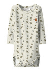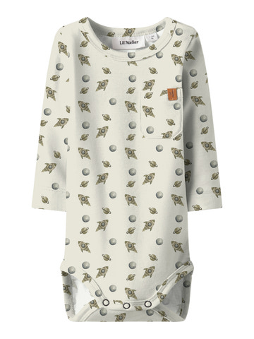 Layo Geo Langærmet Body fra Lil' Atelier i farven Turtledove er et skønt valg til de mindste. Bodyen har et charmerende print med raketter og planeter, der gør den ekstra sjov og hyggelig. Den bløde kvalitet sikrer komfort hele dagen, og de lange ærmer giver god varme på kølige dage. Med trykknapper i bunden er det nemt at skifte ble, og den lille brystlomme med mærke tilføjer et fint, unikt touch. Perfekt til både hverdag og leg, hvor barnet kan bevæge sig frit og komfortabelt.