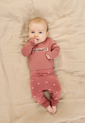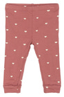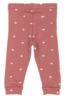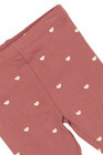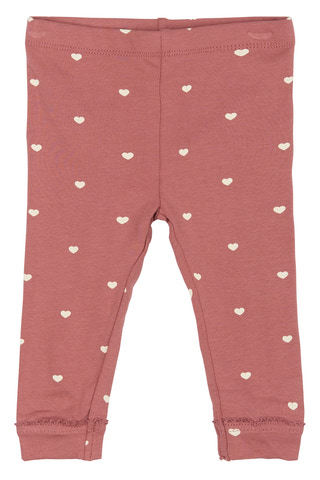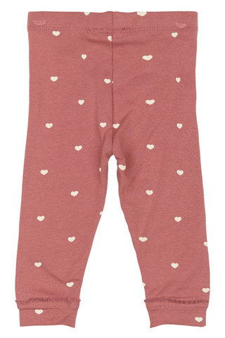 Bedårende leggings i en smuk farve med små hjerteprint. Fremstillet af blødt og strækbart bomuldsstof, der sikrer høj komfort og bevægelsesfrihed for din baby. Ben åbningerne har delikate bølgede kanter, der tilføjer en sød og feminin detalje til designet. Perfekte både til hverdagsbrug og hyggelige stunder.