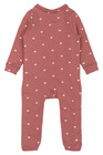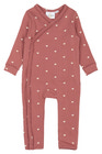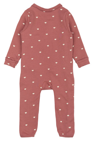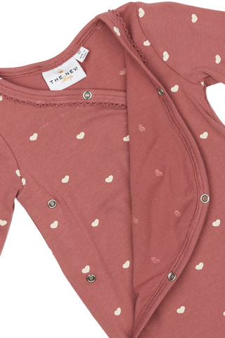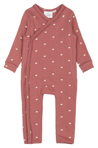 Langærmet slå-om heldragt i en smuk farve med små, delikate hjerter. Heldragten har et praktisk slå-om design med trykknapper langs fronten og indvendigt på benene, hvilket gør den nem at tage på og af. Det bløde bomuldsstof giver maksimal komfort og bevægelsesfrihed, perfekt både til hverdagsbrug og afslappede stunder.