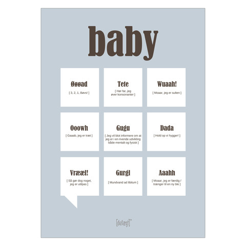 Plakat - Citat Baby A3 fra Poster & Frame er en charmerende og humoristisk plakat, der samler de klassiske babyudtryk og oversætter dem til sjove og genkendelige citater. Plakaten er ideel til børneværelset, hvor den både pynter og skaber smil hos både børn og voksne. Med sit enkle og moderne design passer den ind i de fleste indretninger, og den fungerer også perfekt som en personlig gave til nybagte forældre. De forskellige citater gør det nemt at genkende og forstå de smås lyde og udtryk, og plakaten kan være med til at skabe hyggelige samtaler om barnets udvikling. Dansk design og god kvalitet sikrer, at plakaten holder sig flot i lang tid.