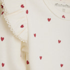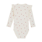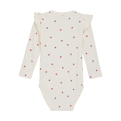 Denne søde langærmede body er fremstillet i en blød og strækbar kvalitet, der giver dit barn maksimal komfort og bevægelsesfrihed. De fine flæsedetaljer ved skuldrene tilføjer et feminint og charmerende udtryk, mens trykknapper forneden gør påklædningen nem og praktisk.