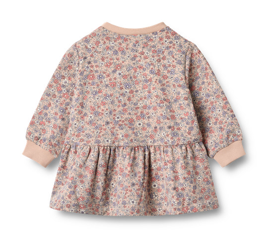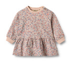 Langærmet sweatkjole med print i blødt økologisk bomuld til baby. Wheat's sweatkjole har en løs pasform, der gør den nem og behagelig for dit barn at have på. Kjolen har en flatterende skæring under taljen med læg, der giver kjolen dejlig fylde i skørtet. Kjolen er perfekt til efterår og vinter, og kan nemt styles med et par leggings eller strømpebukser til.